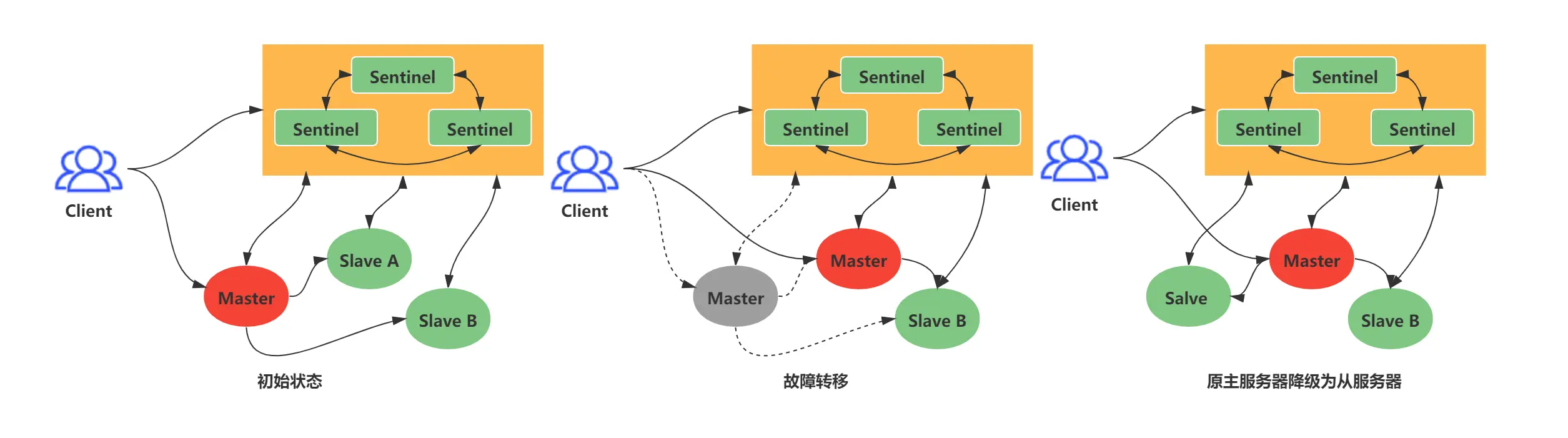 - 第四步:继续监视旧主节点,当这个旧主节点重新上线时,将它设置为新主节点的从节点